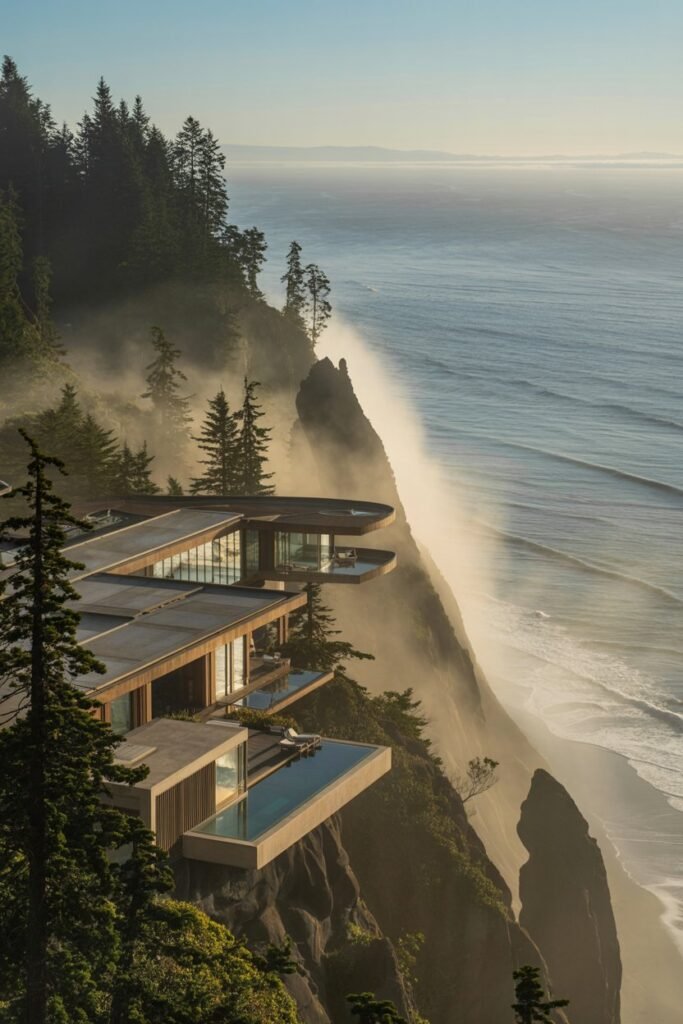 Then the cliffside lodge appeared modern yet earthy, perched above crashing waves, blending seamlessly into the landscape.