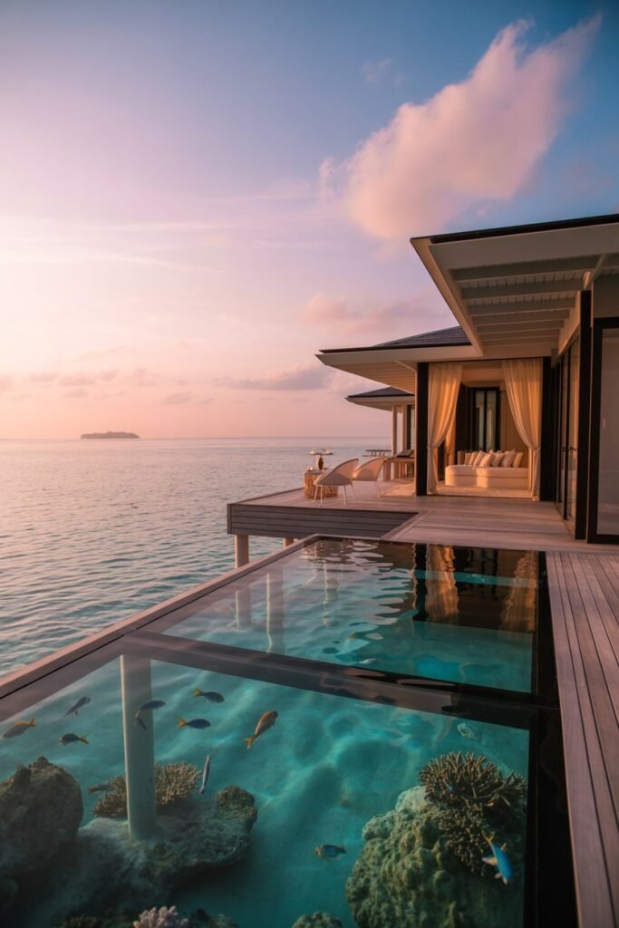 Hurawalhi is home to 5.8 Undersea Restaurant, the world’s largest all-glass underwater dining venue. Sitting below sea level while tropical fish drift past your table feels surreal.