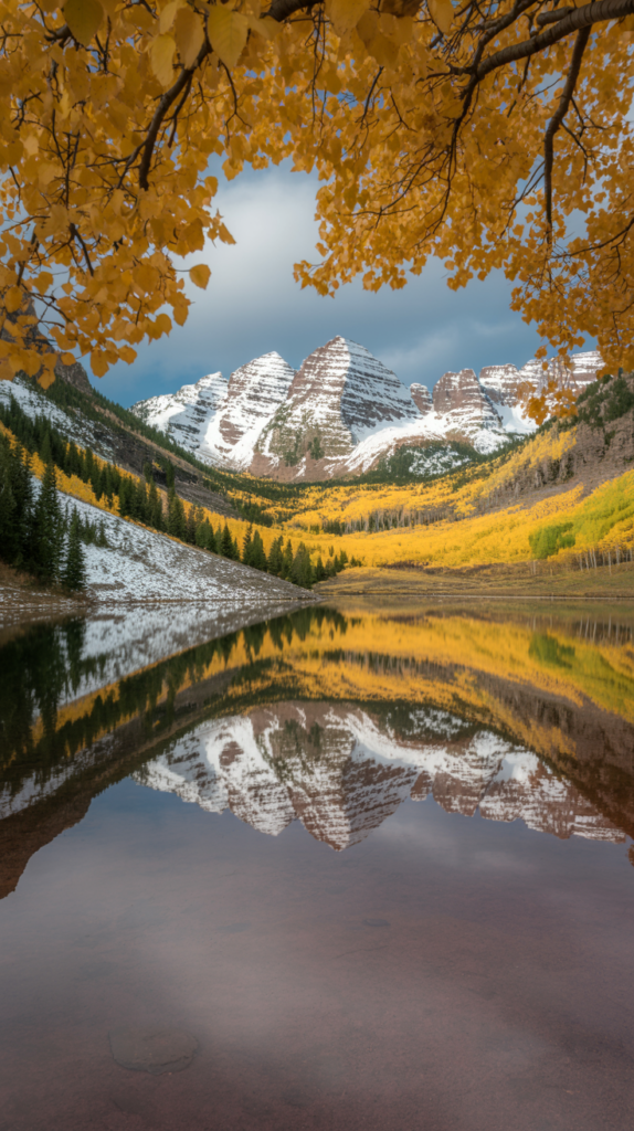 - Maroon Lake / Maroon Bells Scenic Area – classic reflection shots of the twin peaks framed by golden aspens. Arrive at sunrise to avoid crowds and capture glassy reflections.