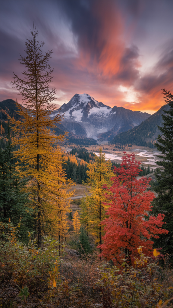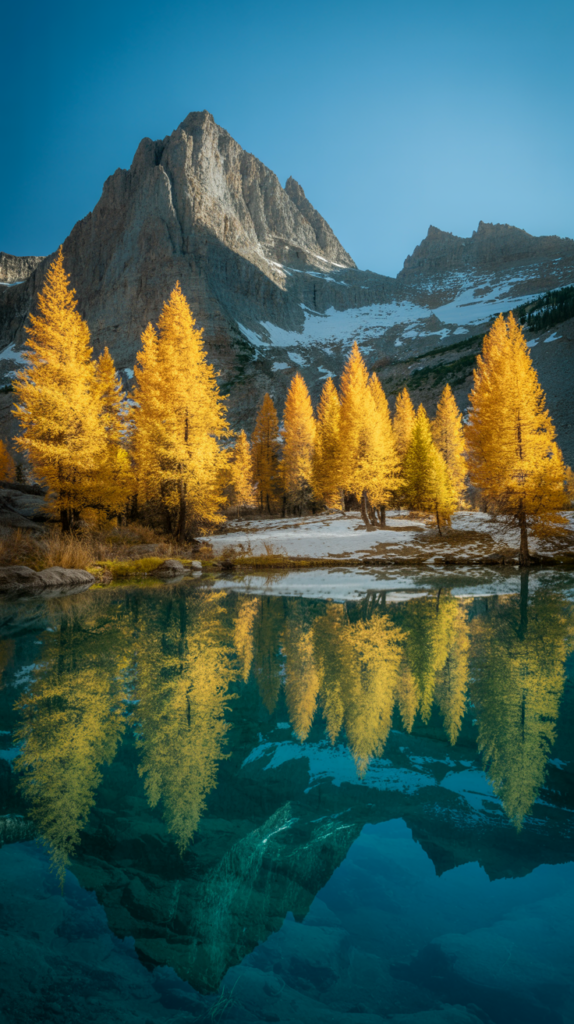 - Larches: concentrate on contrast—gold needles against a dark conifer backdrop or a blue sky. Mid-late September provides short windows; be flexible.