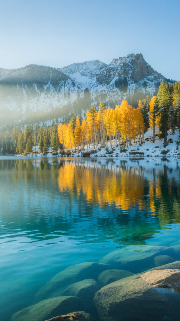 - Use a polarizer to reduce glare on water and deepen skies; shoot after sunrise or before sunset (golden hour). Composition: use the shoreline or foreground boulders to create reflection symmetry. A telephoto (70–200mm) compresses aspen groves into texture; wide-angle (16–35mm) captures the sweeping scale.