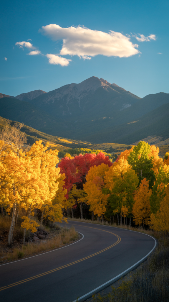 Why September: The San Juan Mountains and the Million Dollar Highway (US-550) showcase aspens cascading down steep slopes and vivid contrasts with red-brown cliffs.