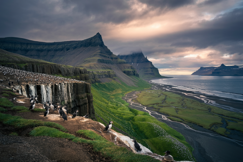 - Base: Ísafjörður (2 nights). Day trips: Hornstrandir boat day tour (or overnight trek), Rauðisandur and Látrabjarg cliffs (puffins in summer), Djúpavík exploration & hotel night.