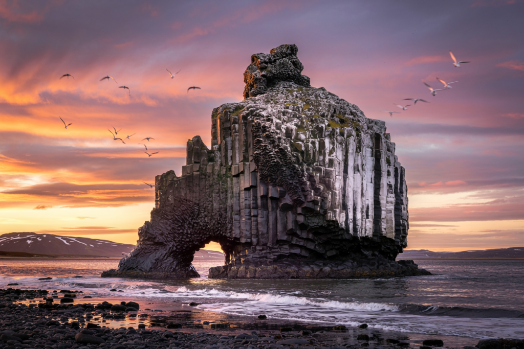 6) Hvitserkur — the “rock dragon” sea stack (Northwest coast)