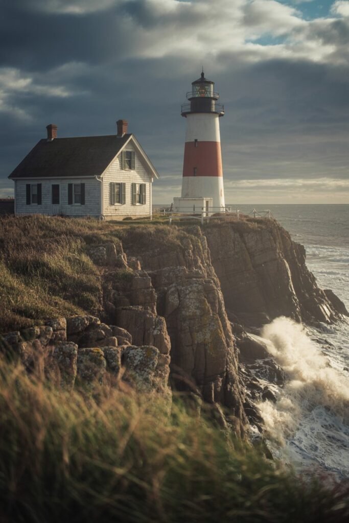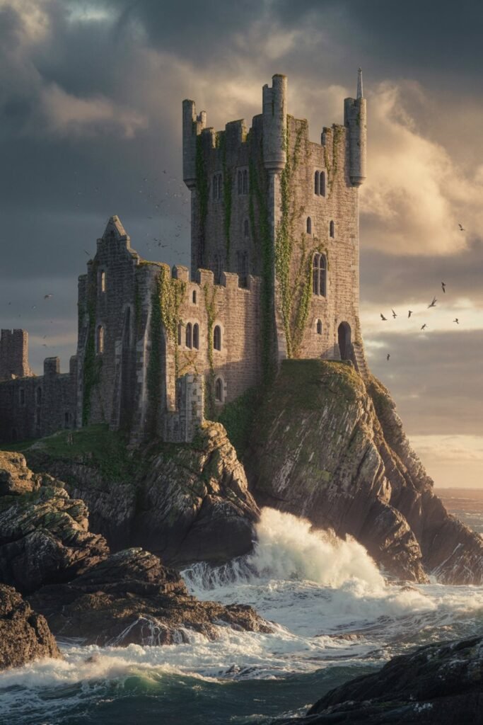 A real-life castle tower perched on cliffs overlooking the Atlantic.