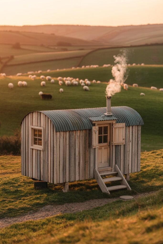 A cozy wooden hut with farmland views, a tiny wood stove, and a surprisingly comfortable bed. It feels tucked away from the world.