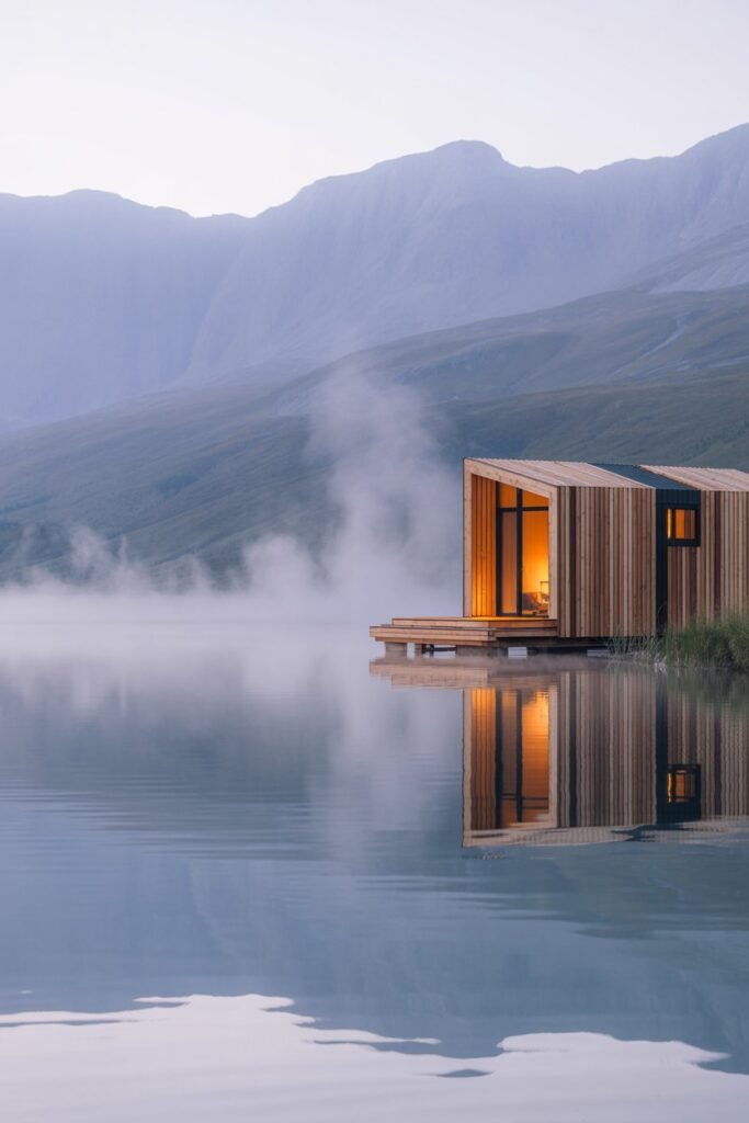 A sleek, Scandinavian-style cabin with floor-to-ceiling windows overlooking endless ocean views.