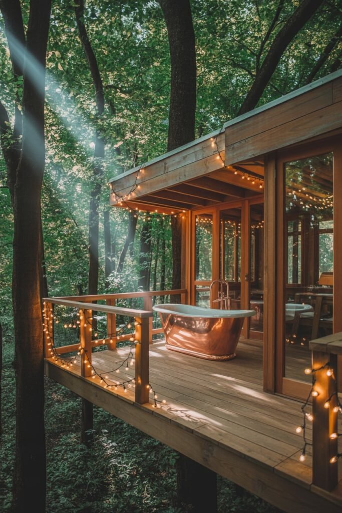 I stayed here during spring and woke up to birdsong echoing through the forest canopy. The outdoor copper bathtub is a dream.