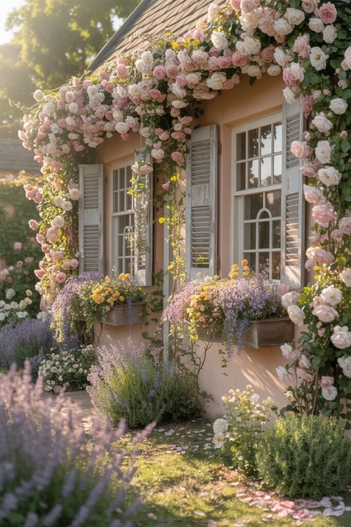 A pastel-hued dream surrounded by wildflowers, roses, and ivy.