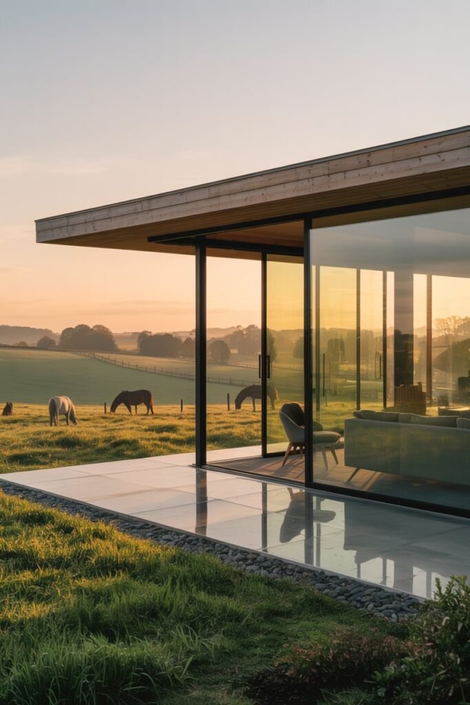 With wide glass walls overlooking green fields and grazing horses, this cottage feels airy, modern, and peaceful.