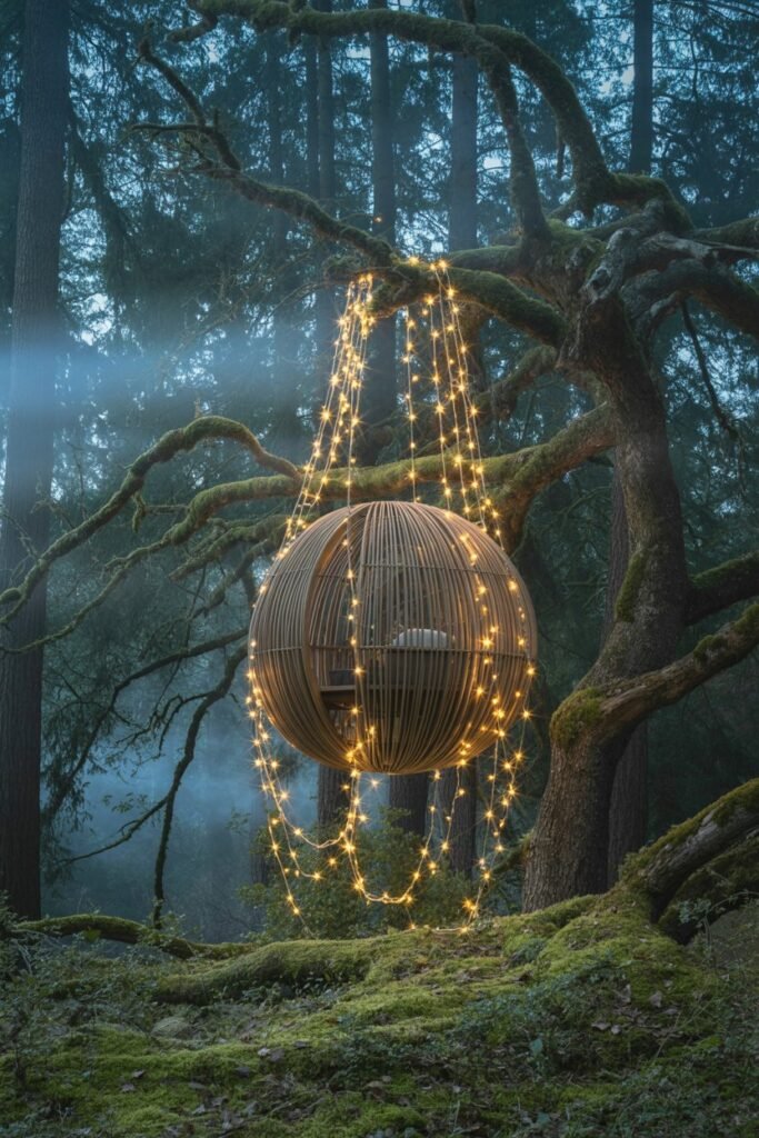 A whimsical pod suspended among the trees with twinkling string lights and a hobbit-style vibe.