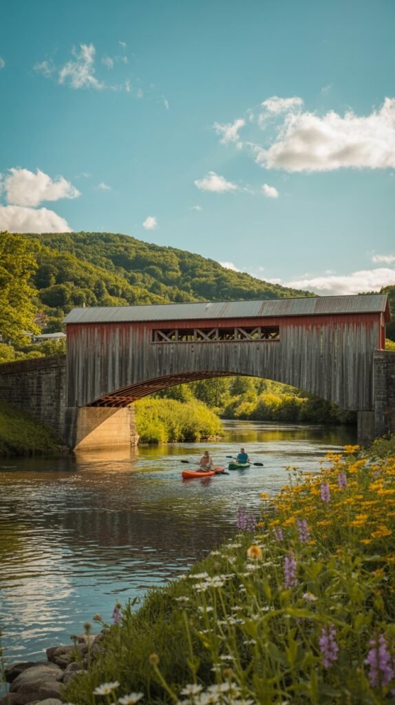 The Ottauquechee River meanders gently through Woodstock, offering calm waters for kayaking and canoeing.