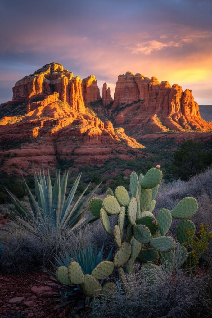 Ultra-realistic cinematic sunrise over Sedona red rock formations, desert plants foreground, glowing orange light on rocks, peaceful romantic desert landscape