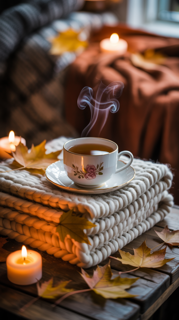 Imagine a steaming mug of tea (or coffee) resting on plaid wool blankets, surrounded by autumn leaves scattered like a natural garnish.