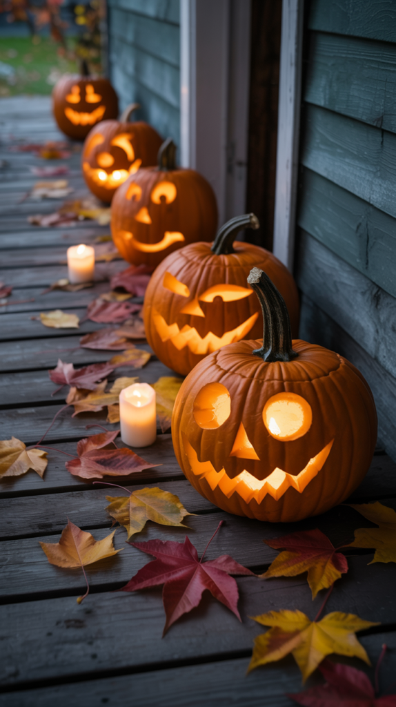 Visualize a rustic cottage porch with pumpkins stacked neatly on wooden steps, surrounded by dried corn stalks and cozy lanterns.