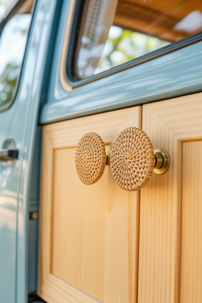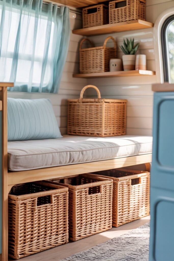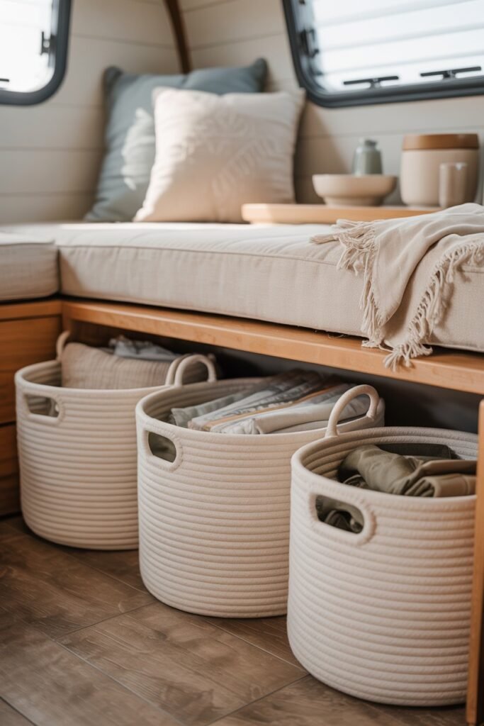 Use woven baskets under the bed, in cabinets, or on open shelves to organize while adding natural texture.