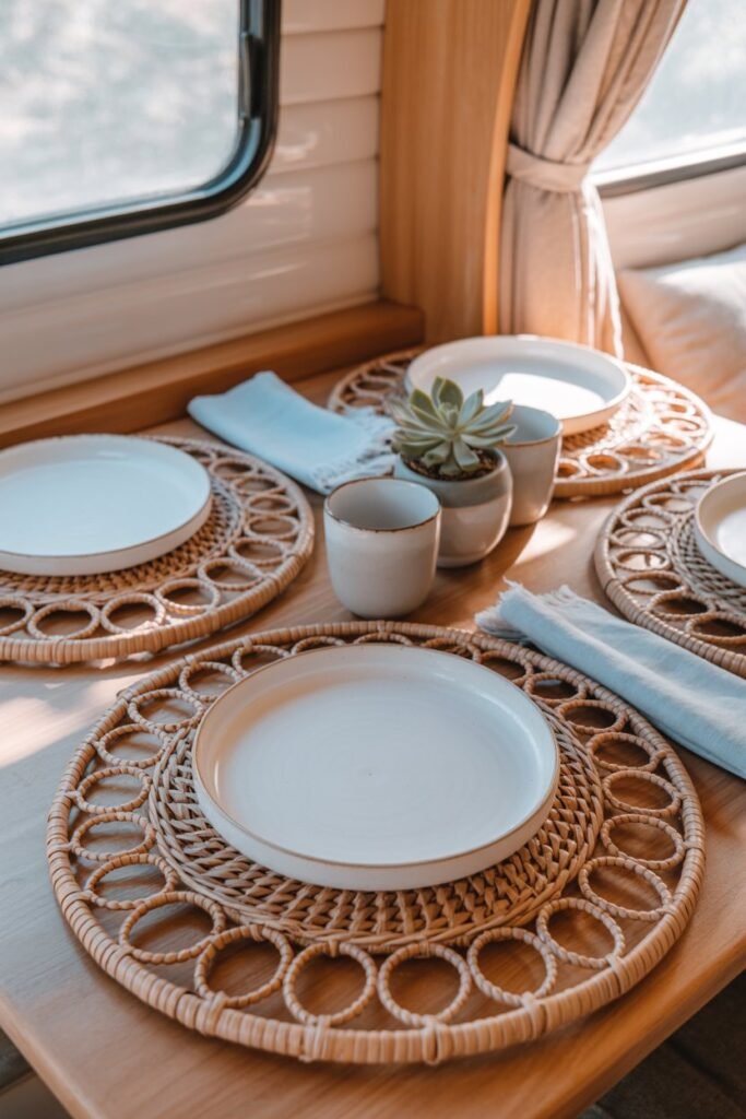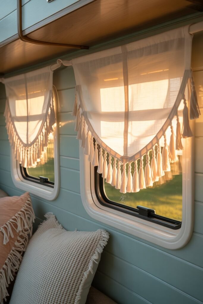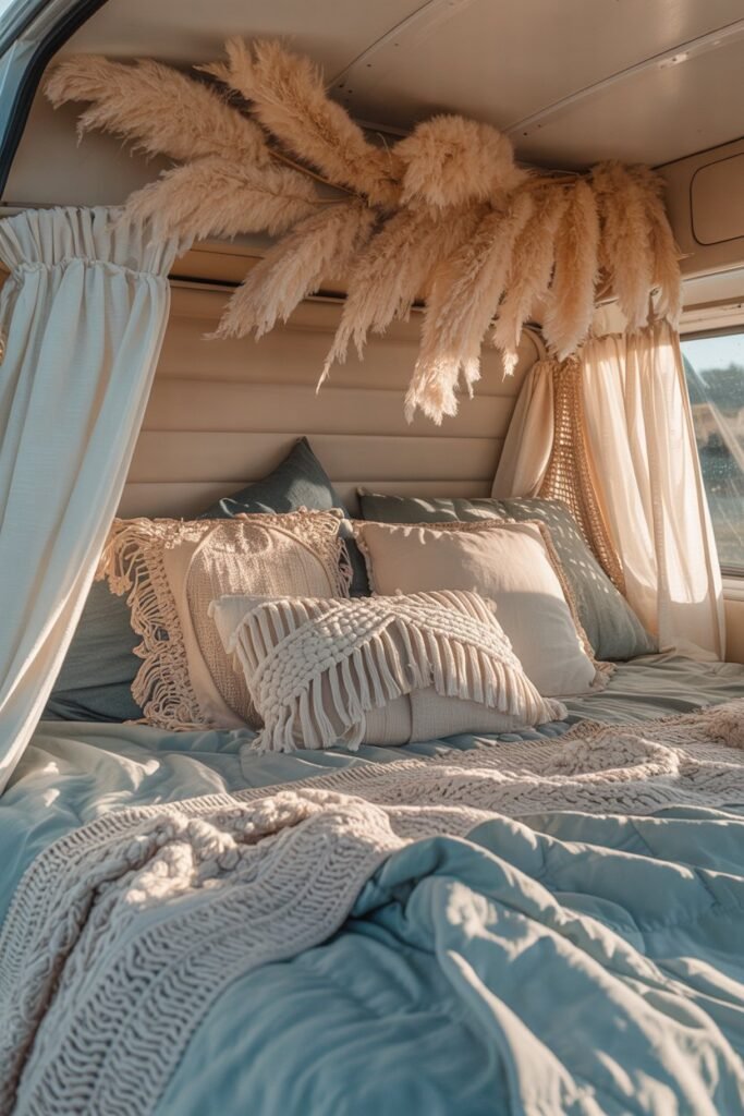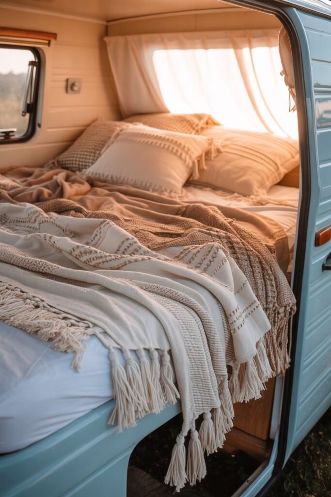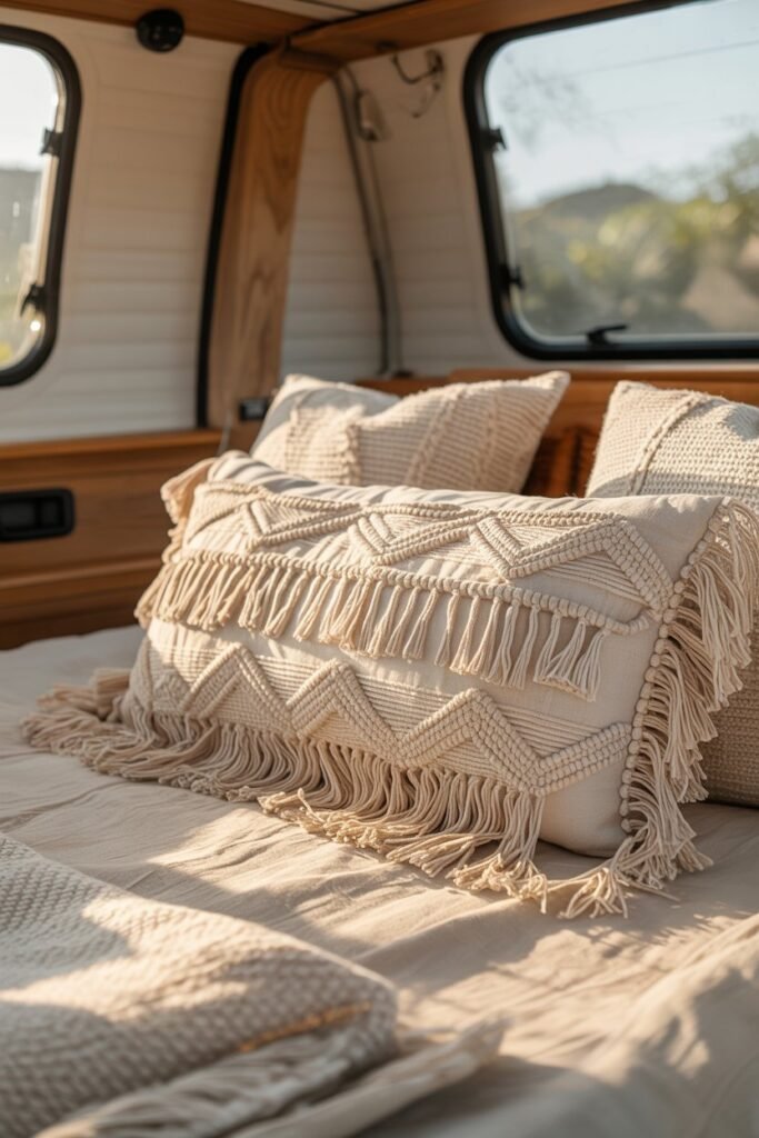 Layer tasseled, tufted, woven, and embroidered pillows on your dinette benches or camper bed.