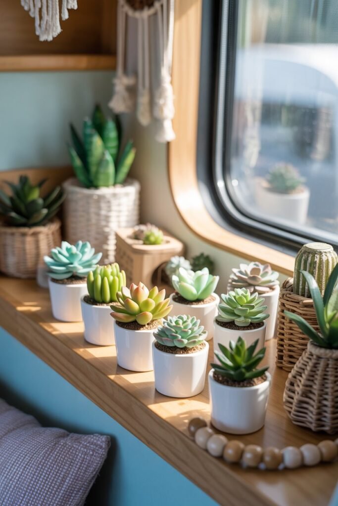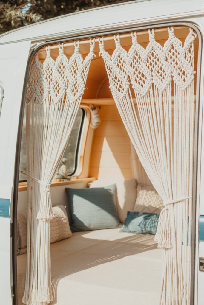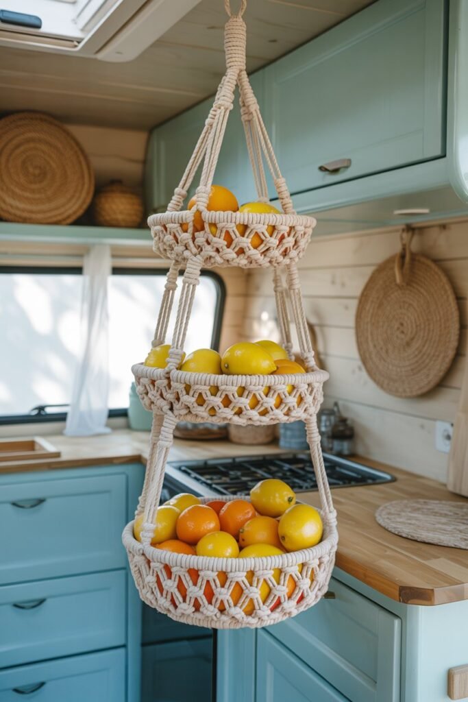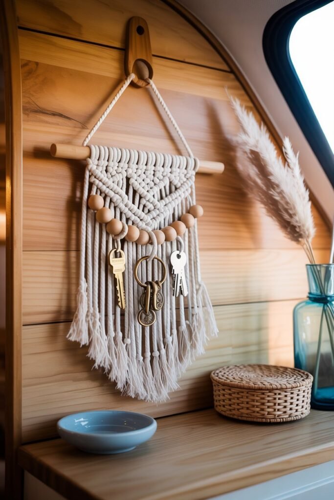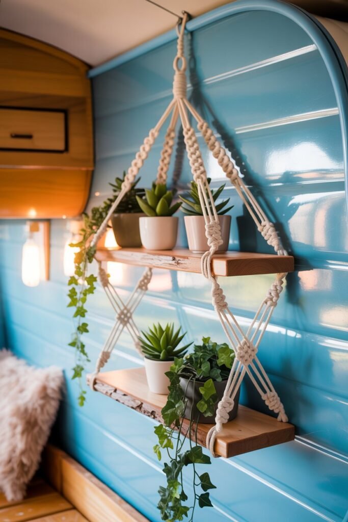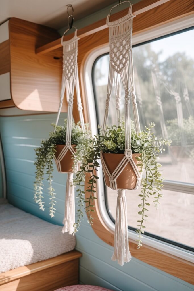 Hang macrame plant holders by windows or at corners for a breezy, earthy camper feel.