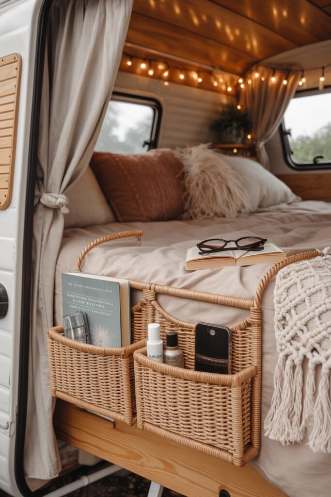 Handwoven rattan bedside caddy that keeps essentials like books, glasses, and remotes organized and within reach. Adds a natural boho touch to your bedroom or camper interior.