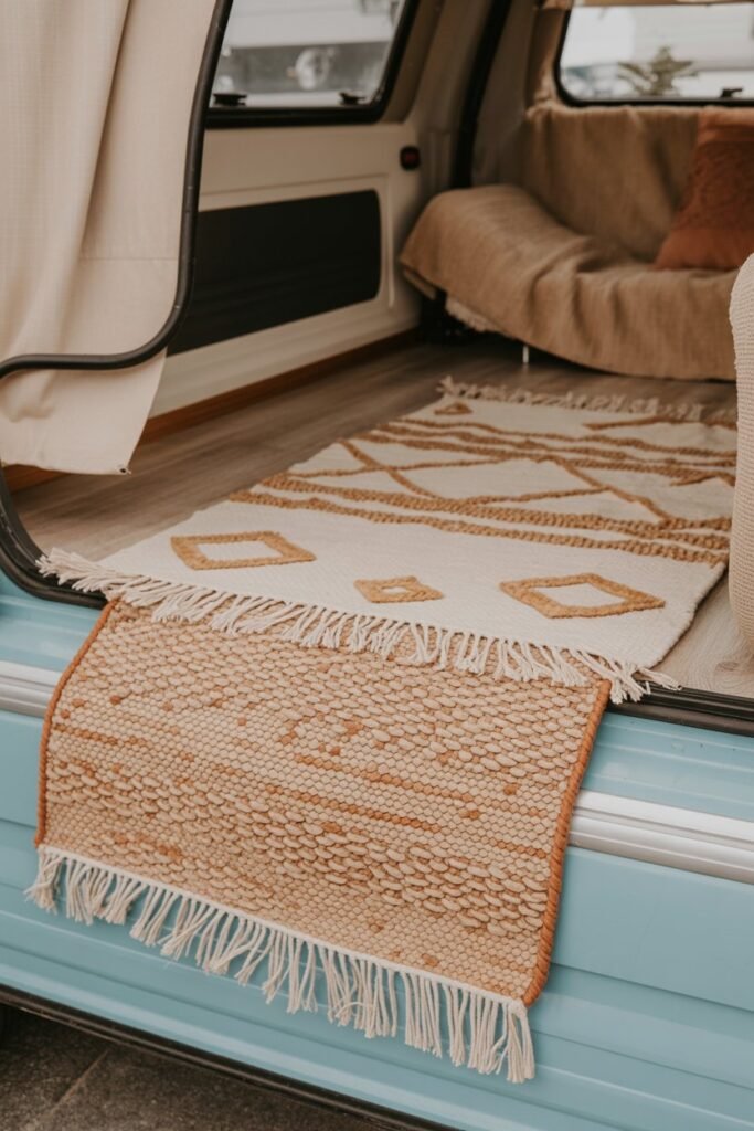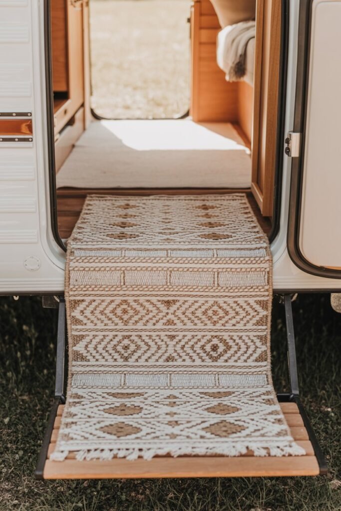 Decorative boho runner rug with intricate patterns and soft texture, perfect for adding warmth and style to hallways, living areas, or van interiors. Its durable weave ensures long-lasting beauty while enhancing any bohemian-inspired space.