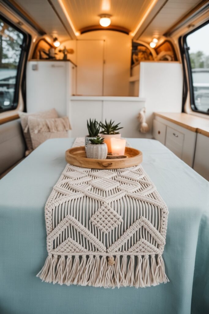 Elegant macrame table runner that brings a boho-chic touch to dining tables, consoles, or van interiors. Handcrafted with intricate knots, it adds texture, style, and a cozy, artisanal vibe to any space.