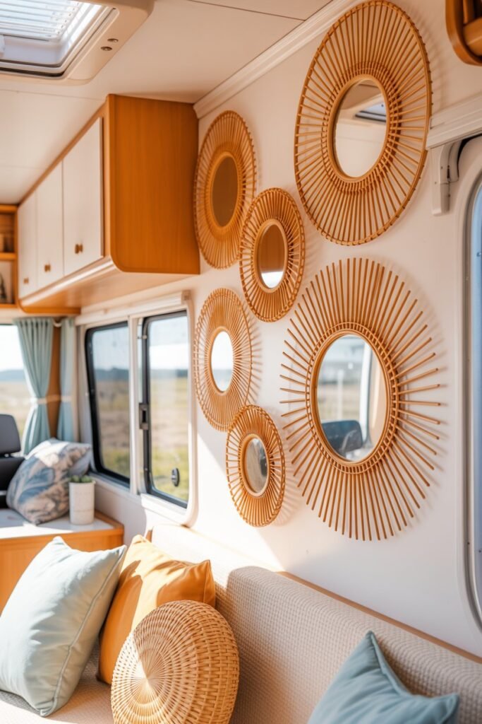 Round rattan or sunburst mirrors enlarge your space and add boho charm without remodeling.