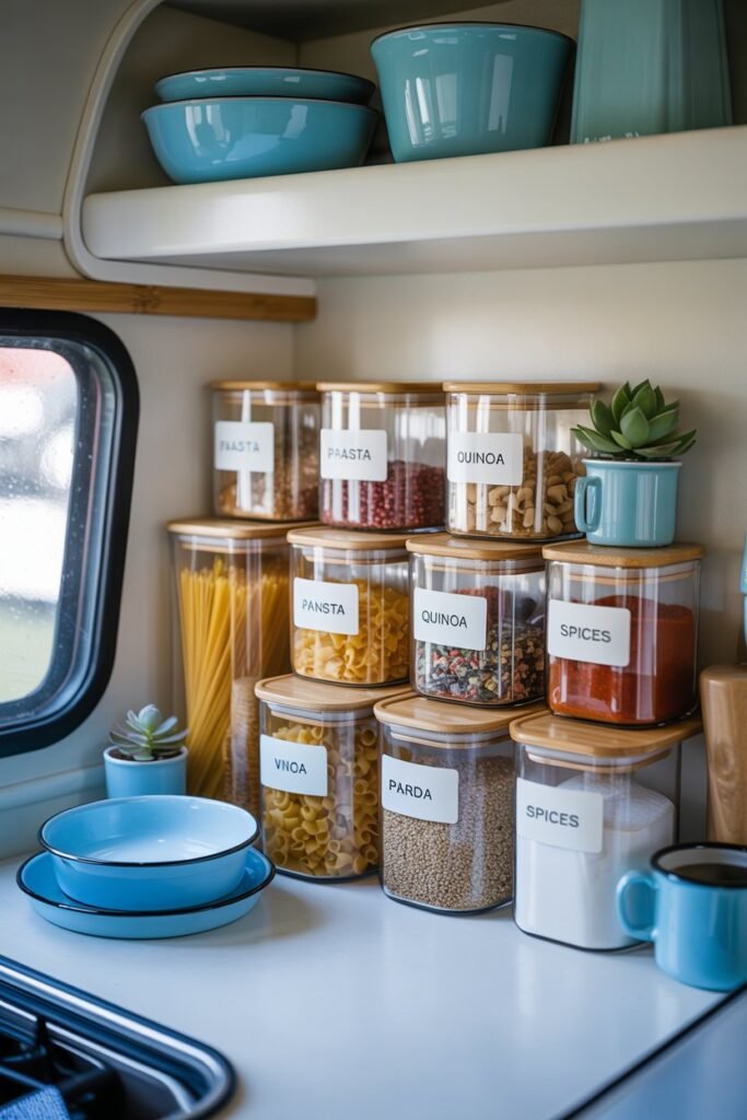 Organize snacks, coffee, and dry goods beautifully on open shelving.