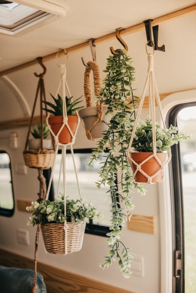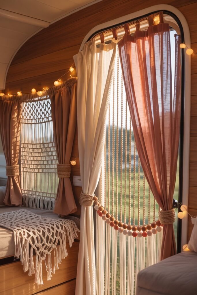 Macramé adds texture, movement, and softness to a camper without taking up any floor space.