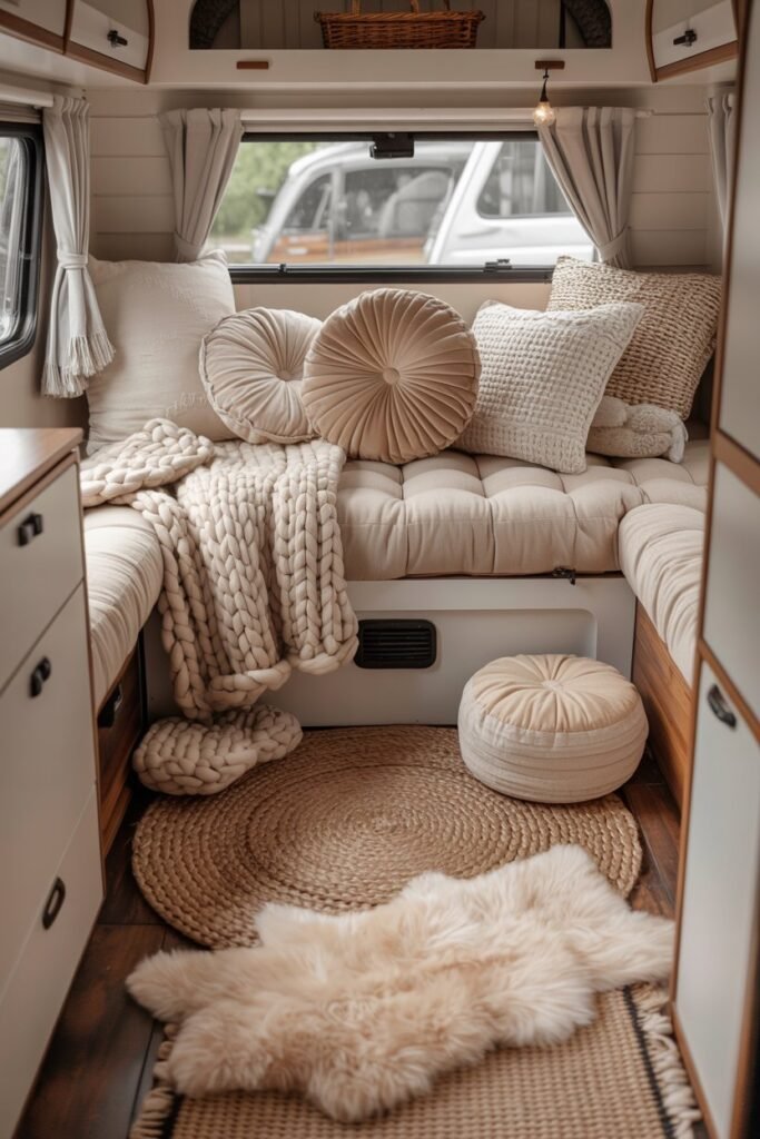 Neutrals reflect light, creating a calm retreat that doesn’t feel cramped even in a van.