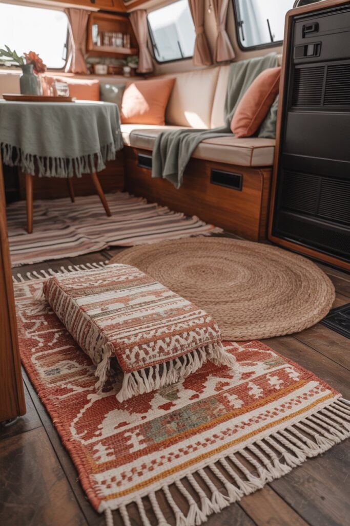 Layered rugs add warmth, protect your floors, and bring texture to your camper all the hallmarks of boho styling.
