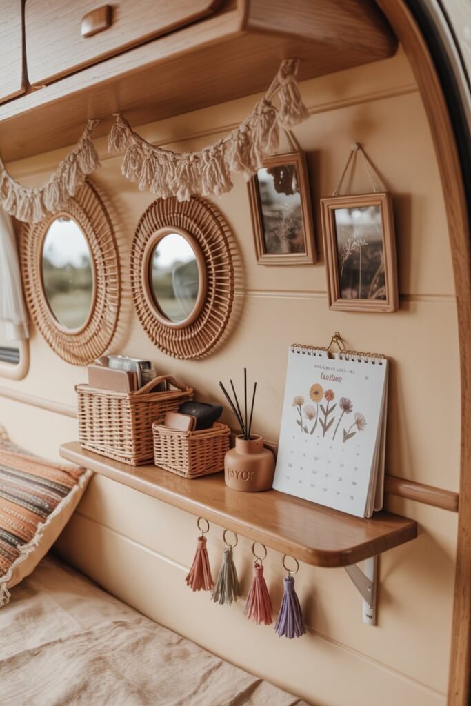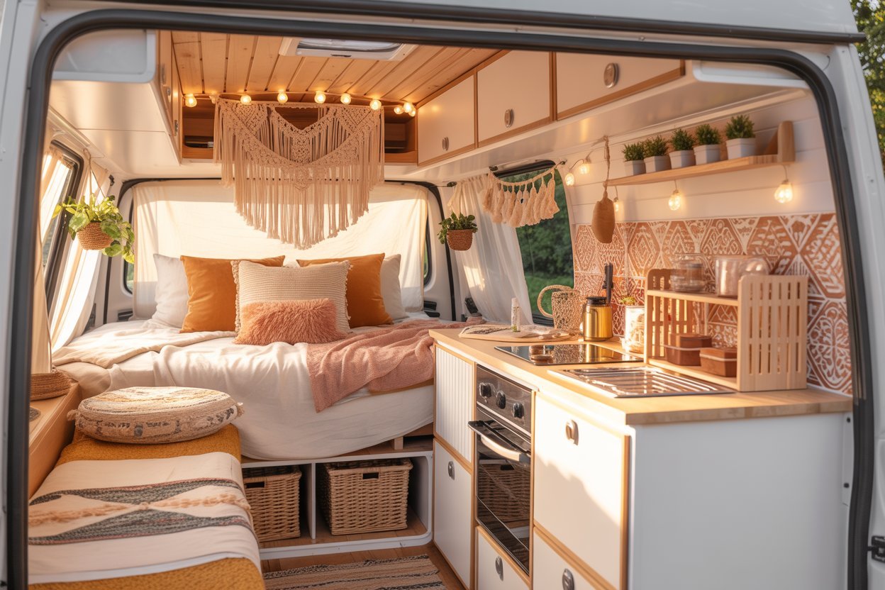 A compact kitchenette with soft boho touches can turn simple cooking moments into peaceful little rituals on the road.