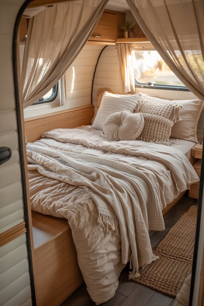 Quality bedding transforms your sleep, adds warmth on chilly nights, and instantly elevates the overall vibe of your camper.
