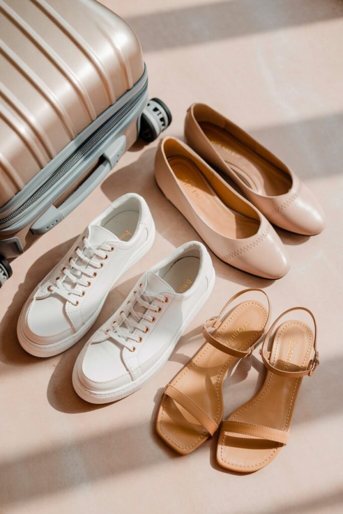 (White sneakers or supportive trainers) - Dressy but walkable flats or sandals