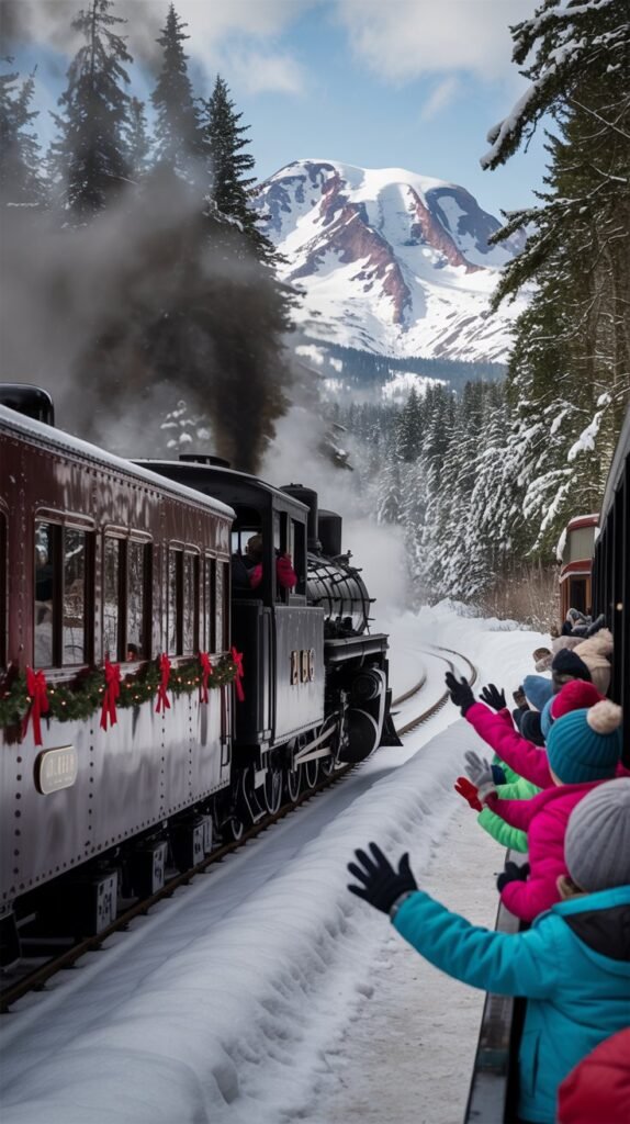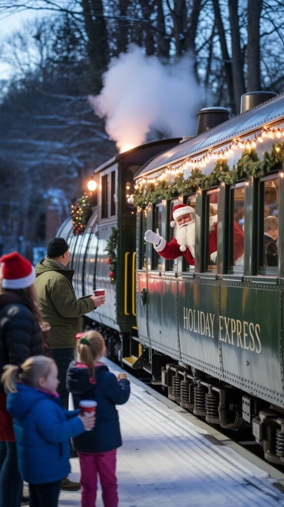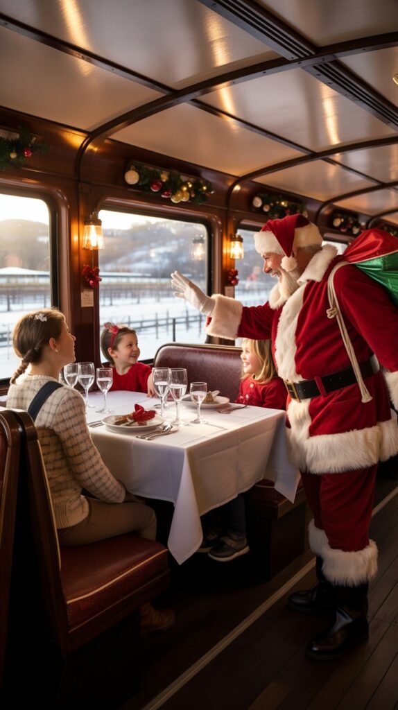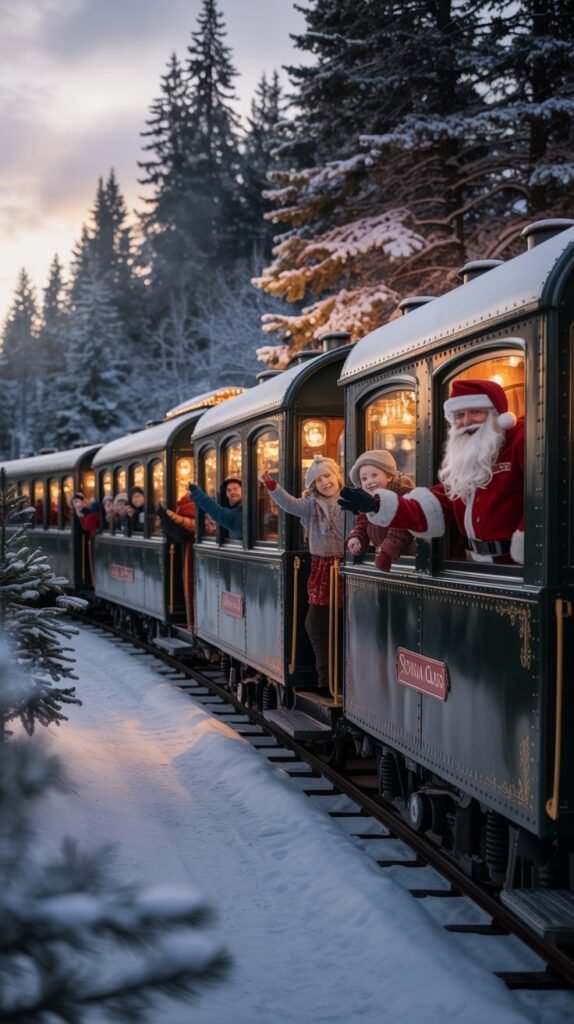 Others offer cozy Santa rides where little ones giggle with anticipation, elegant dinner trains with gourmet holiday menus, or immersive “North Pole” adventures that sparkle with childlike wonder.