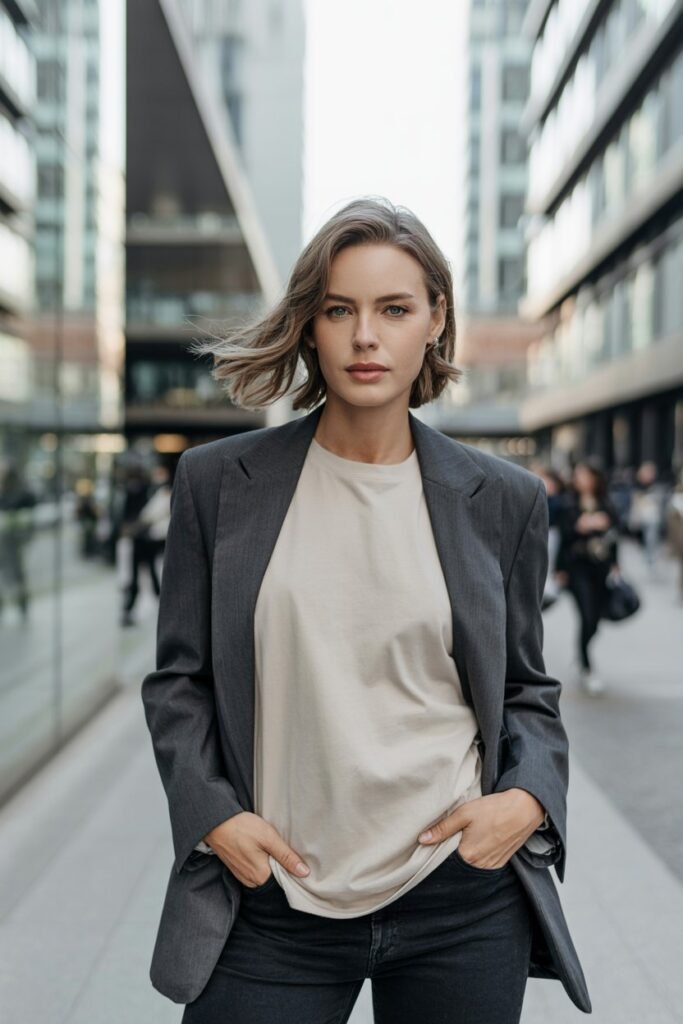 • Layered: Jeans + tee + cardigan or jacket