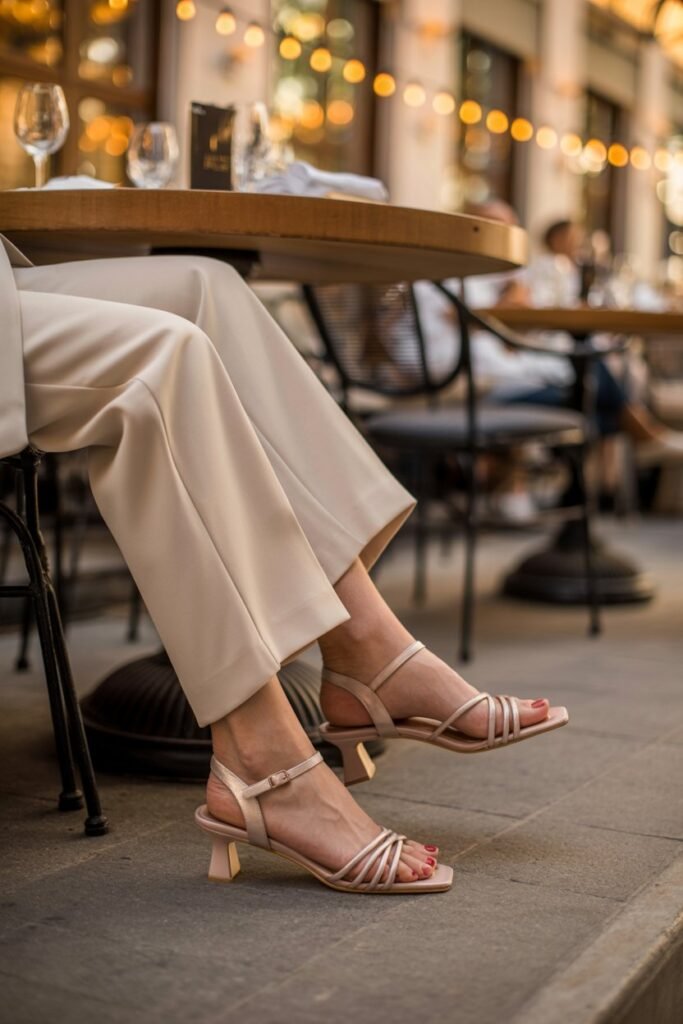 • Evening: Neutral top tucked into trousers + sandals + gold jewelry